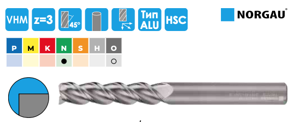 018335080 Фреза концевая высокопроизводительная NORGAU Industrial с удлиненной режущей частью 8 мм, Z3, VHM Фреза концевая высокопроизводительная, диаметр 8 мм. Основное применение — обработка алюминиевых сплавов с содержанием кремния до 8%, меди, латуни и бронзы. С удлиненной режущей частью, острой вершиной и перекрытым центральным зубом. При врезании по оси инструмента, необходимо снижать подачу на 70% от рабочего значения. Угол наклона винтовой канавки 45°. Имеет три режущие кромки с полированным покрытием для легкого отхождения стружки из зоны резания. Фреза выполнена из монолитного твердого сплава VHM. Общая длина – 100 мм, рабочая часть – 40 мм. Диаметр хвостовика – 8 мм. купить со склада в России