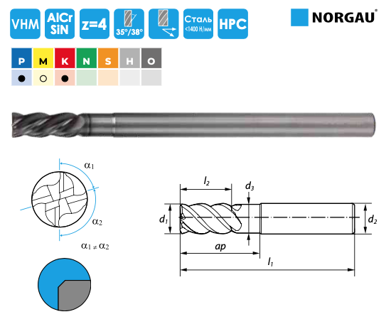 018145120 Фреза концевая твердосплавная NORGAU Industrial удлиненная 12 мм, Z4, VHM/AlCrSiN Фреза твердосплавная, диметр 12 мм, с удлиненным хвостовиком и обниженной шейкой. Основное применение: обработка сталей с пределом прочности до 1000Н/мм2 (32HRC) и чугунов. Допускается обработка сталей с пределом прочности до 1400Н/мм2 (44HRC). С защитной фаской при вершине и 4 режущими кромками. Неравномерный торцевой шаг зубьев уменьшает вибрации в процессе обработки. Может применяться для обработки пазов в сплошном материале. Врезание только под углом или по спирали, по оси инструмента (сверление) не допускается. Общая длина фрезы - 150 мм, рабочая часть - 30 мм, диаметр хвостовика - 12 мм. купить со склада в России