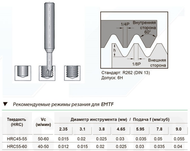 EMTF06P100 Резьбофреза (HGT) ф4.65х3х50, z=3, dхв=6, Lэффект=14, размер резьбы M6х1.0 HGT Купить из наличия со склада в Москве