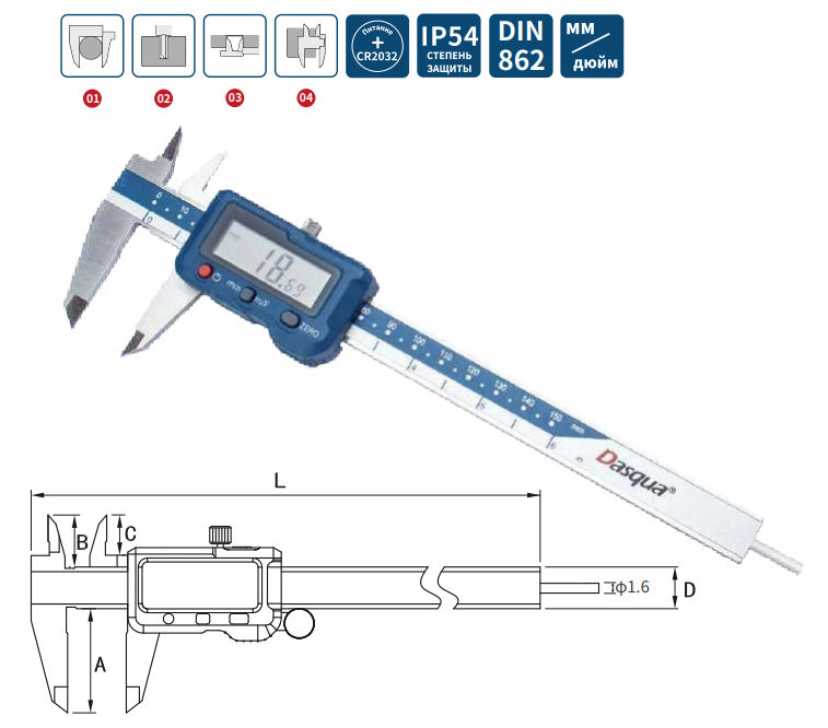 DASQUA 1804-1075 Цифровой штангенциркуль (Basic Modle), 0-300 мм, 0.01 мм купить со склада в Москве