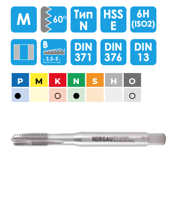 013056008 Метчик машинный NORGAU Industrial для сквозных отверстий M8, форма B, HSS-E Метчик машинный M8 с шагом 1,25 мм. Форма B (3,5-5 витков). Применяется для нарезания метрической резьбы в скозных отверстиях с углом профиля 60° (M) в материалах с пределом прочности до 800Н/мм2 (23HRC). Изготовлен из быстрорежущей стали HSS-E (аналог Р6М5К5). Соответствует европейскому стандарту по DIN371. Отверстие под резьбу – 6,8 мм, размер посадочного квадрата – 6,2 мм. Общая длина – 90 мм, рабочая – 18 мм. Диаметр – 8 мм. купить со склада в России