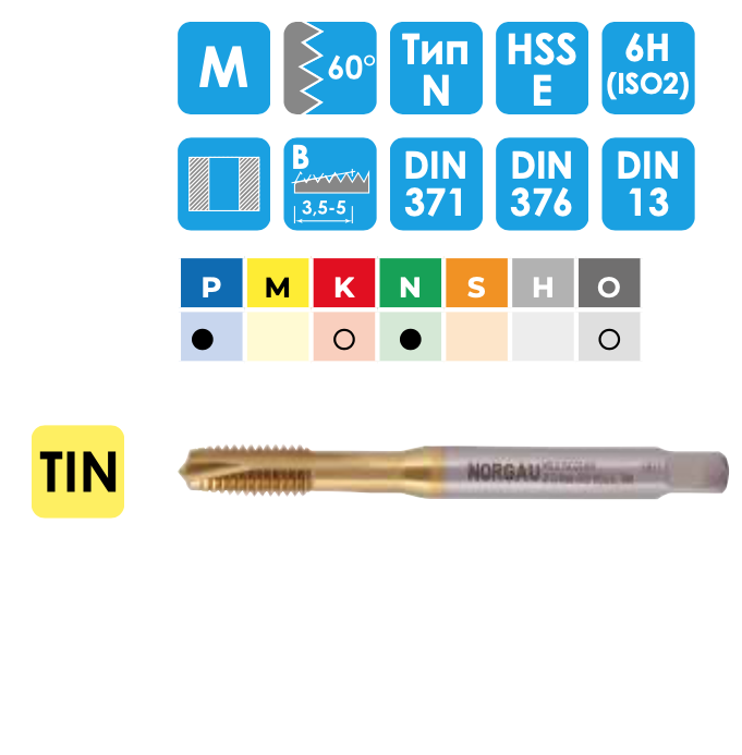 013066003 Метчик машинный NORGAU Industrial для сквозных отверстий М3, форма B, HSS-E/TIN Метчик машинный M3 с шагом 0,5 мм. Форма B (3,5-5 витков). Применяется для нарезания метрической резьбы в скозных отверстиях с углом профиля 60° (M) в материалах с пределом прочности до 800Н/мм2 (23HRC). Изготовлен из быстрорежущей стали HSS-E (аналог Р6М5К5) с изностсойким покрытием TIN. Соответствует европейскому стандарту по DIN371. Отверстие под резьбу – 2,5 мм, размер посадочного квадрата – 2,7 мм. Общая длина – 56 мм, полезная длина – 18 мм, рабочая – 9 мм. Диаметр – 3,5 мм. купить со склада в России