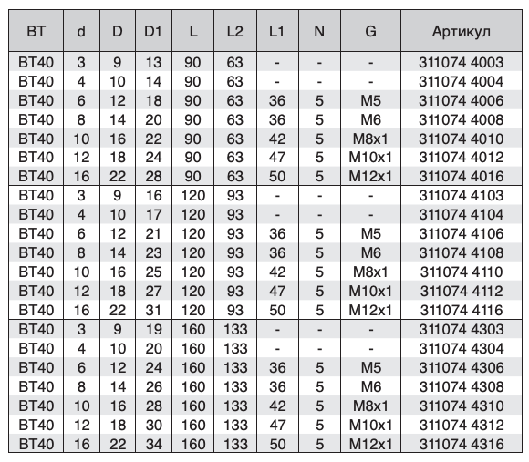 3110744006 Патрон термозажимной тонкий BT40xd6x90 мм MAS403BT UMIC Патрон термозажимной тонкий BT40xd6x90 мм MAS403BT предназначен для закрепления осевого инструмента. Патроны используются при индукционной, контактной усадке. После нагрева патрона расширяется посадочное отверстие, а в результате его охлаждения инструмент из-за сужения отверстия надежно и точно закрепляется в термооправке. Конус BT40, посадочный диаметр инструмента 6 мм, вылет 90 мм, меньший диаметр корпуса 12 мм, больший диаметр корпуса 18 мм, угол конуса 3 градуса. Форма подачи СОЖ AD, класс балансировки G 2,5 при 25000 мин-1. Возможна поставка патрона с формой AD/B и другим классом балансировки по запросу. Штревель и ключ для регулировки вылета инструмента приобретаются отдельно.