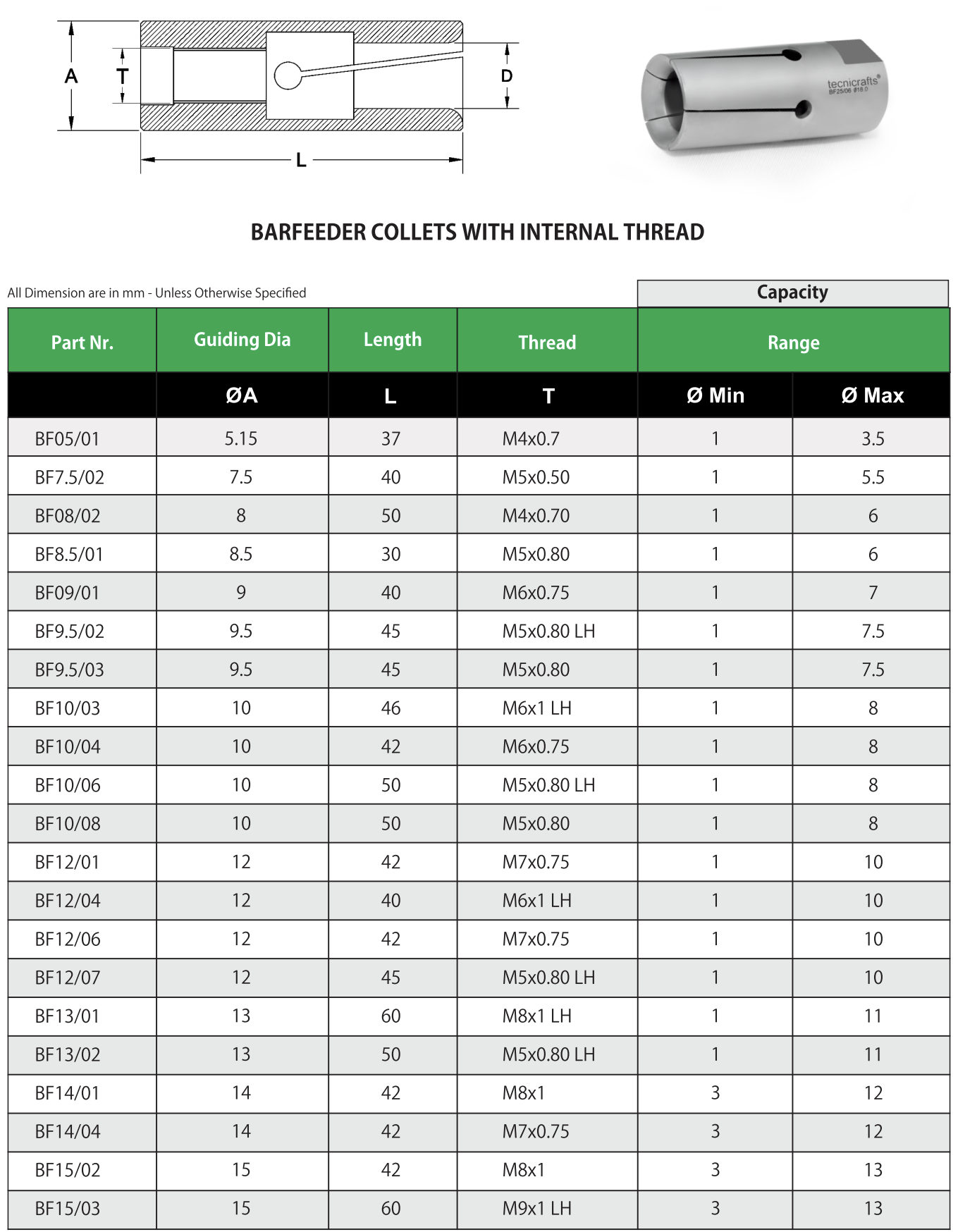 Цанга барфидера с внутренней резьбой BF12/01 d3 Tecnicrafts Цанга барфидера с внутренней резьбой BF12/01 d3 используется в автоматических механизмах подачи прутка. Барфидер исключает остановку станка для смены заготовки. После использования первого прутка, система подаст следующую заготовку автоматически, обеспечивая длительную работу станка.