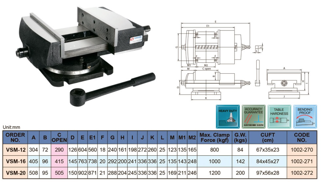 VSM-12 Тиски станочные поворотные с двухсторонним зажимом (открытие 290 мм) VERTEX в наличии